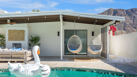 For this project, we created an outdoor patio with the surrounding desert in mind. Neutral tones of beige, off-white, and grey mingle with bold dashes of blue and evergreen. For materials we focused on durable wood and metal surfaces along with hard-wearing Sunbrella fabrics. Touches of handwoven cotton and glimmers of brass mingle perfectly with a custom fireplace and hanging club chairs. An outdoor fan and private shower allow loungers to beat the heat in true desert style.